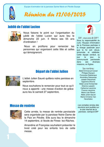 Article publié par response.text()) .then(text => { html = text showLoading = false; })" class="flex justify-center animate-grow-on-hover--small">Paroisse Ste Marie en Pévèle Scarpe • Publié le Mardi 04 février 2025 • 916 visites EAP 25-01-16 a diffuser Télécharger 311.2 Ko Télécharger compte rendu reunion du 3 fevrier 2025 Télécharger 632.7 Ko Télécharger CR reunion EAP 060325 Télécharger 371 Ko Télécharger compte rendu 23 avril 2025 a publier Télécharger 564.3 Ko Télécharger compte rendu de la reunion EAP du 12 juin 2025 a p Télécharger 558.4 Ko Télécharger